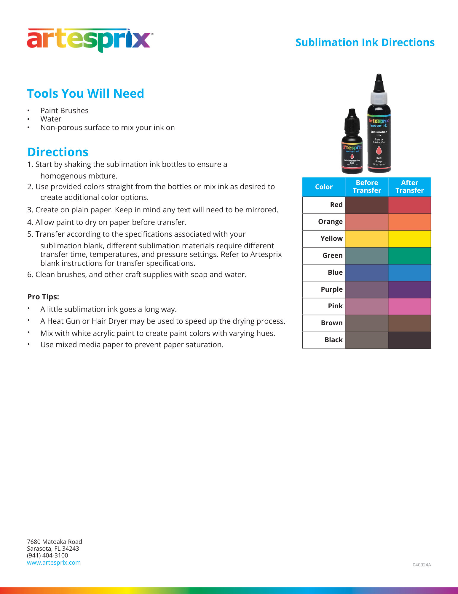 Sublimation Craft Ink is ready to help you achieve the designs of your sublimation dreams! Artesprix Inks give you the ultimate creation control when it comes to sublimation transfers. Use them as watercolors, monoprints, airbrush, even hydro-dipping! Available in nine colors, Artesprix’s specialty formulated line of Sublimation Craft Inks gives you the ultimate control over your homemade professional projects.